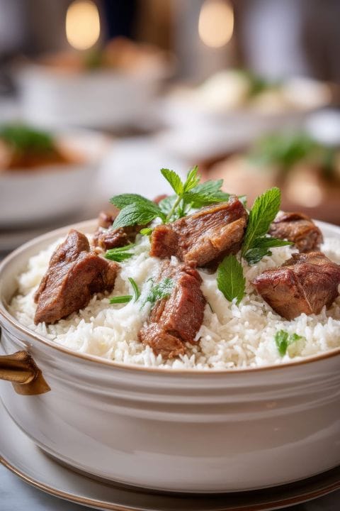 Tender lamb cooked in a rich fermented yogurt sauce (jameed), served over rice and thin bread — traditionally shared during celebrations and family gatherings.