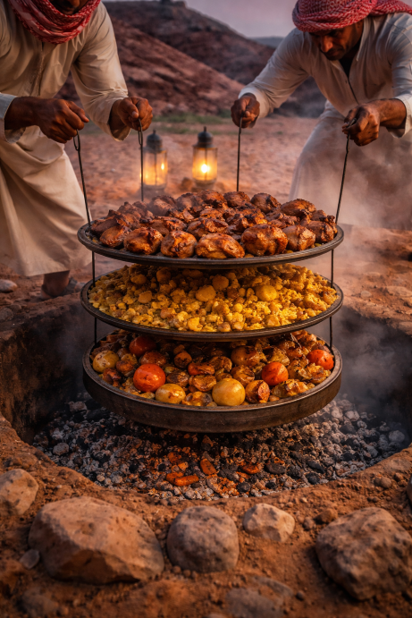 In Wadi Rum, you’ll encounter zarb, a traditional Bedouin barbecue cooked underground in the sand.