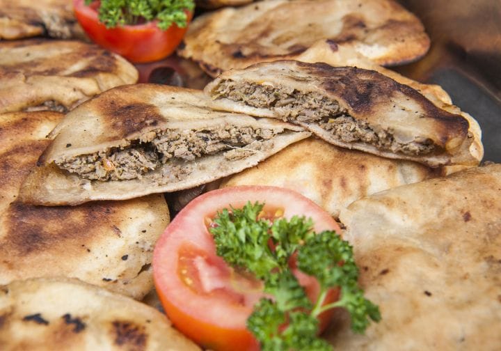It’s made by stuffing spiced minced meat into baladi bread, then baking or grilling it until crispy.